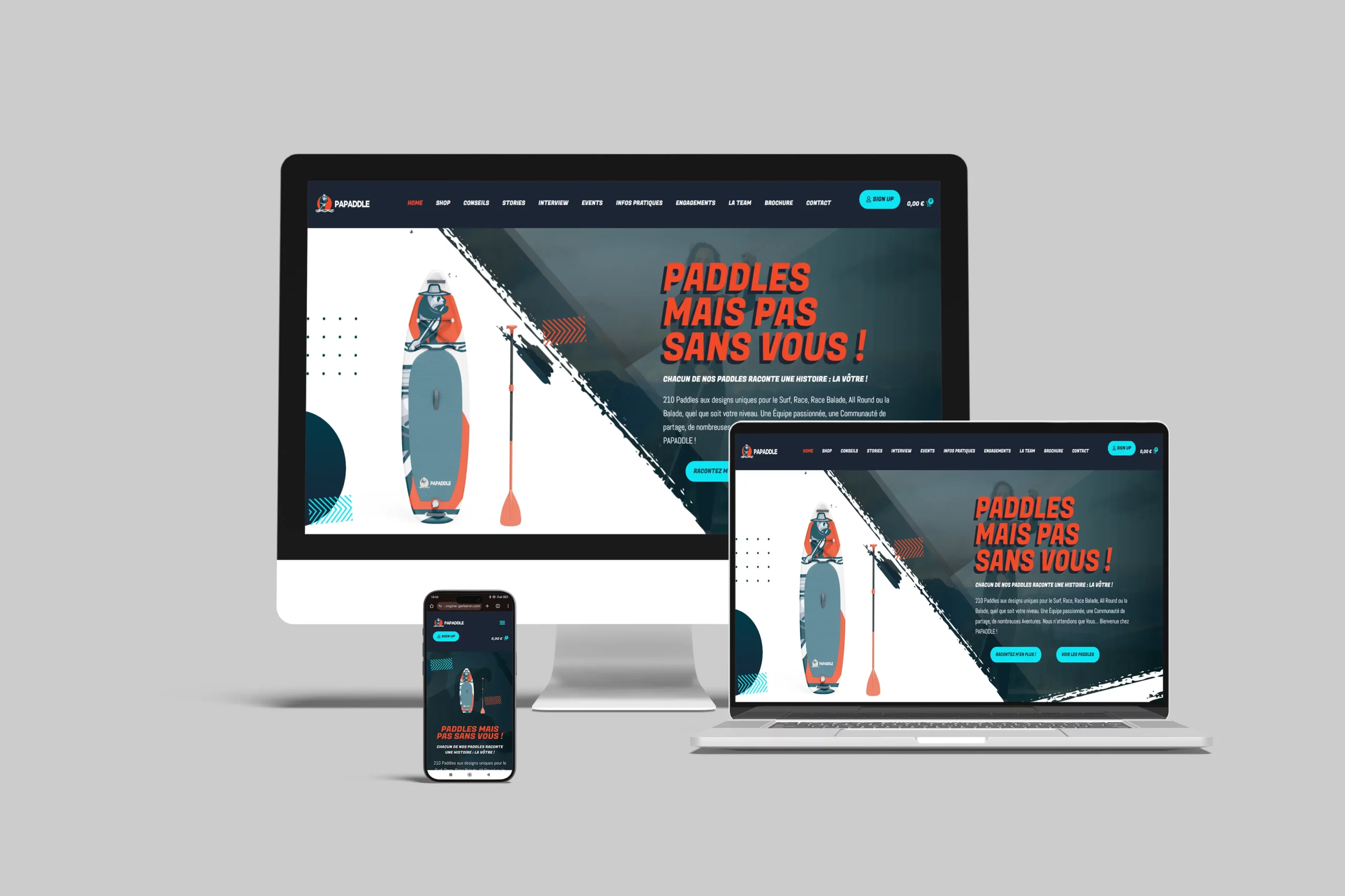 Création du site web Papaddle, boutique en ligne dédiée à la vente de paddles et d’accessoires, pensée pour refléter l’univers de la glisse et offrir une expérience d’achat fluide et immersive.